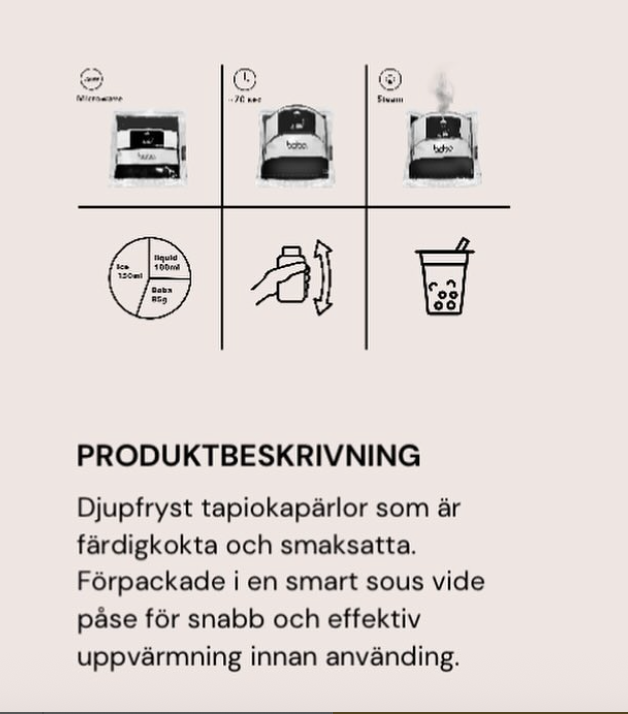 Förvaras djupfryst och är förpackade i smarta sous vide påsar där varje påse motsvarar en servering och skapad för att snabbt kunna tillreda en boba tea inom 1-2 minuter.