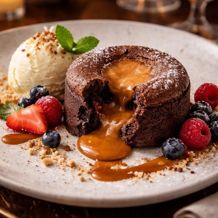 Vår chokladfondant med karamellfyllning bjuder på en lyxig kombination av rik choklad och silkeslen karamell som rinner ut när kakan öppnas. Kontrasten mellan mjuk choklad och varm karamell ger en dessertupplevelse som verkligen förför. Enkel att tillaga och lyxig att servera – perfekt med glass, vaniljsås, grädde eller frukt. En elegant favorit som alltid levererar.